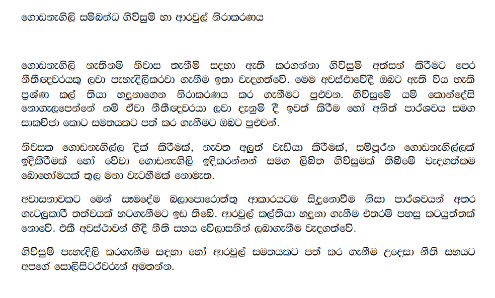 ගොඩනැගිලි නව නිවසක් තැනීම සඳහා ඇති කරගන්නා ගිවිසුම් අත්සන් කිරීමේ පෙර නීතිඥවරයකු ලවා පැහැදිලි කරවා ගැනීම ඉතා වැදගත් වේ. මෙම අවස්ථාවේදී ඔබට ඇති විය හැකි ප්රශ්න කල් තබා හඳුනාගෙන නිරාකරණය කර ගැනීම ප්රයෝජනවත් වේ. ගිවිසුමේ යම් කොන්දේසි නොගැලපෙන්නේ නම් ඒවා නීතිඥවරයා ලවා දැනුම් දී ඉවත් කරගැනීම හෝ අනෙක් පාර්ශවය සමඟ සාකච්ඡා කර එකඟතාවයකට පැමිණීම ඔබට කළ හැකිය.